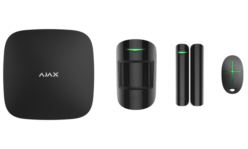 Το κιτ εκκίνησης για το σύστημα ασφαλείας Ajax. Το κιτ αποτελείται από το κέντρο, τον ανιχνευτή κίνησης, τον ανιχνευτή ανοίγματος και το μπρελόκ με κουμπί πανικού.